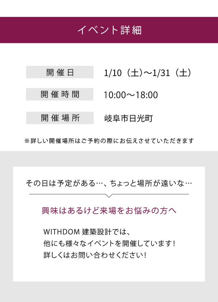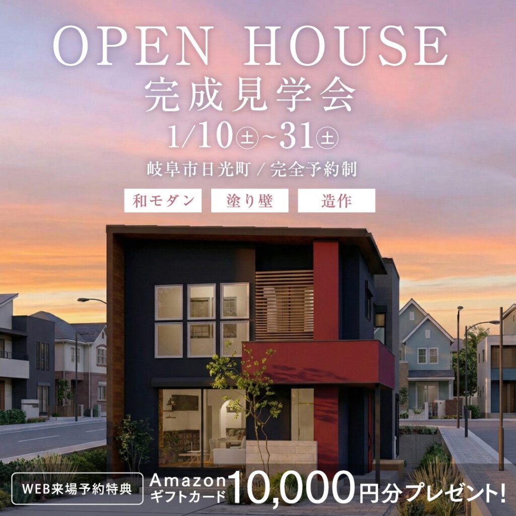この度、お施主様のご厚意により岐阜市日光町にて「新築完成見学会」を開催することとなりました!日時:2026年1月10日(土)〜1月31日(土)場所:岐阜市日光町(詳しい会場地図はご予約の際にお伝えさせていただきます)このページからご予約いただいた方に限り、Amazonギフト券1万円プレゼントキャンペーン実施中!ぜひ、この機会にWITHDOM Gifuが建築するリアルなお家をご見学ください。