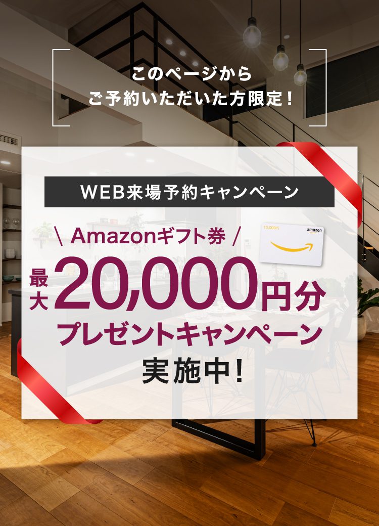 ①スタジオ及びイベント(完成見学会・オーナー様邸見学会等)への初回来場後にAmazonギフト券1万円分のコードを後日メールにてプレゼント。
